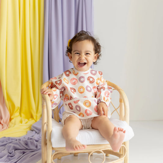 Öncelikle bebeğinizin sağlığını, ardından rahatlığını ve şıklığını ön planda tutarak en kaliteli kumaşlar ve özenli tasarımlarla renkli küçük dünyalara farklı bir dokunuş katıyoruz.
