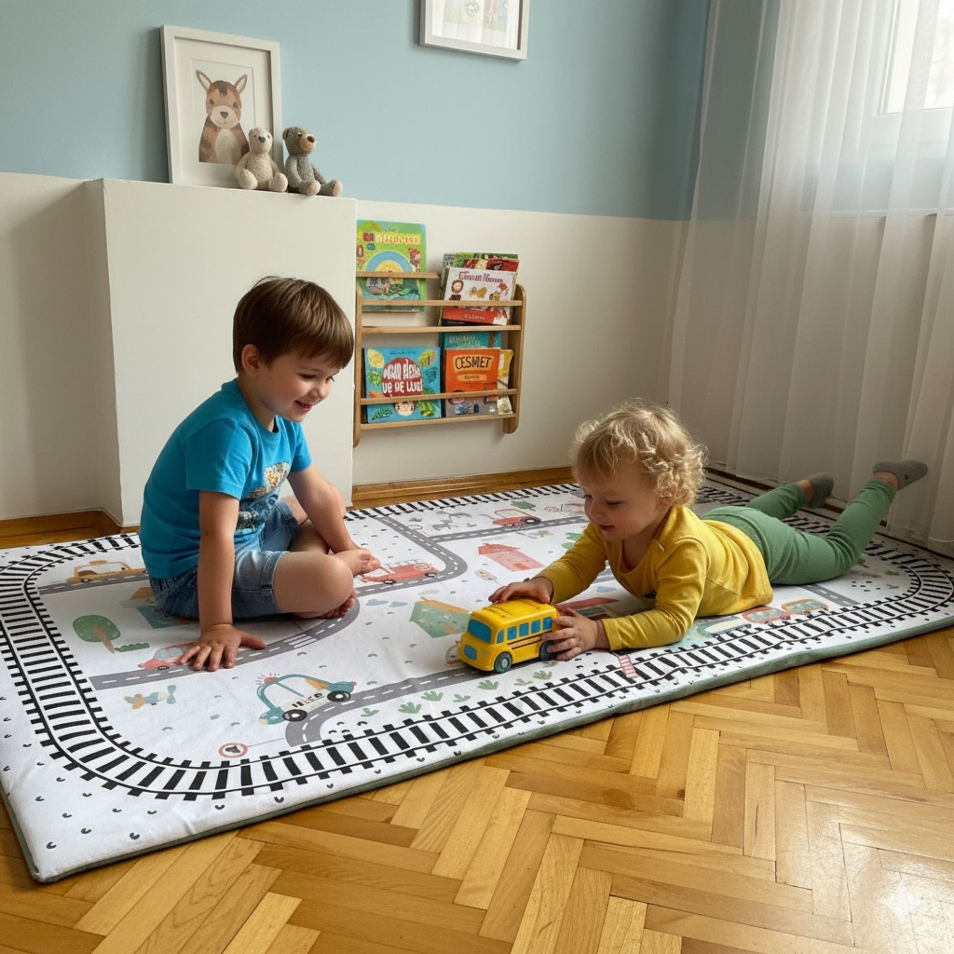 Tren yolu - taşıtlar oyun halısı çocukların hem tren hem de araba gibi taşıtlar hakkında hayal güçlerini kullanmalarına olanak tanır. Oyun kurmalarına yardımcı olur. Aynı zamanda farklı ulaşım araçlarının nasıl çalıştığını ve nasıl birbirleriyle etkileşime girdiklerini anlamalarını sağlar.